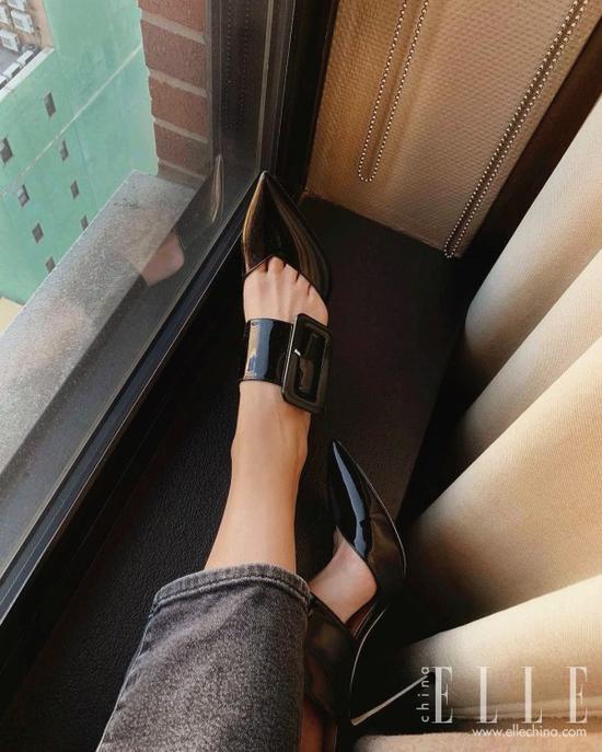为了要体现出新鞋在显腿长上的优势,尽一切可能地伸长双腿来秀新鞋就是你必须要掌握的技巧了。通过秀脚踝的方式,让人一眼注意到鞋子和纤细脚踝,堪称晒鞋POSE中的“性价比之王”。这一方法尤其适宜用在尖头鞋上,延伸效果更明显。